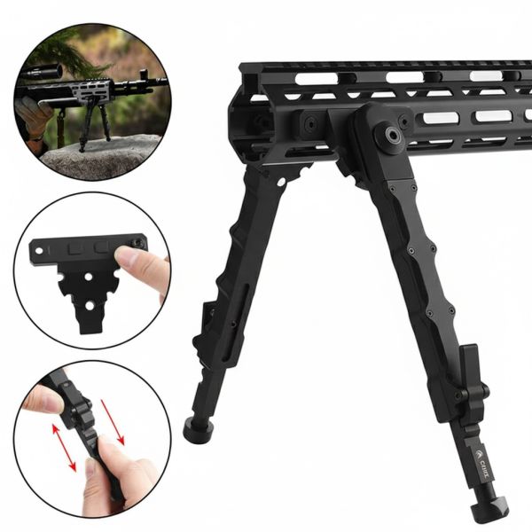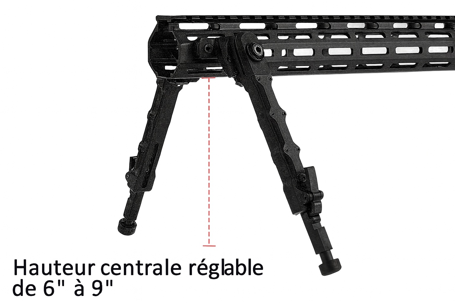 Fixation directe sur rail M-LOK Installation solide sans adaptateur Pliage bidirectionnel à 5 positions : rangement compact et déploiement rapide Réglage de hauteur micrométrique : 6" → 9" (15,24 cm → 22,86 cm) Idéal pour conserver l’équilibre de l’arme sans alourdir la crosse. Design discret et professionnel.
