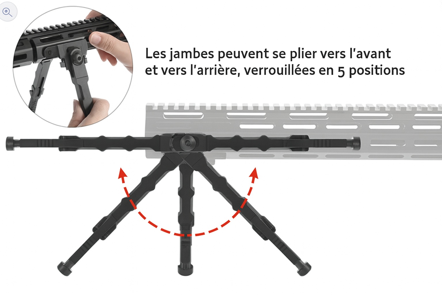 Conseils d’utilisation : - Contrôlez régulièrement le serrage après les premiers tirs. - Ne transportez pas l’arme avec le bipied en position déployée si cela gêne le passage en étui/valise. - Nettoyez et lubrifiez légèrement les articulations pour préserver la fluidité du mécanisme.