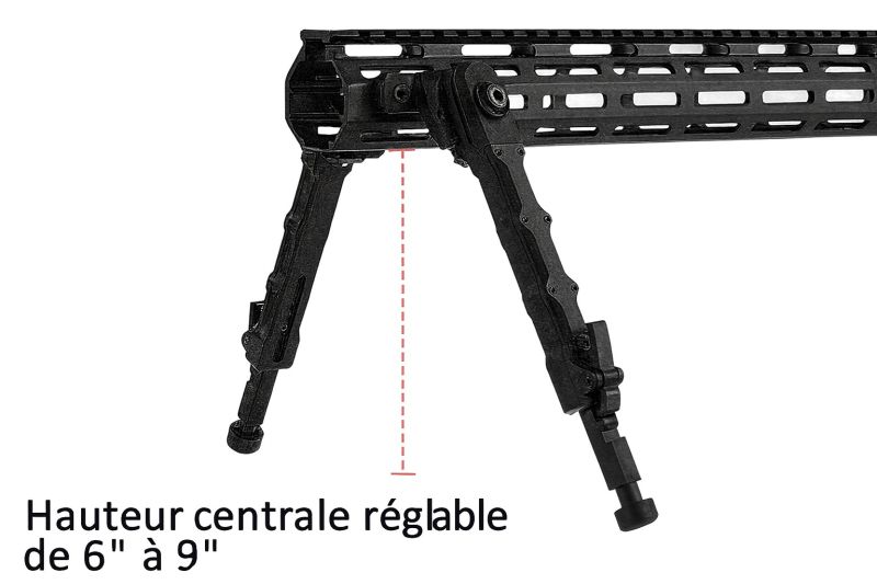 Caractéristiques techniques : - Modèle : MTS V9 (AR15) Fixation : direct garde main M-LOK - Matériau : aluminium de qualité supérieure pour un excellent compromis solidité/légèreté - Finition : noir mat Hauteur réglable : 6" – 9" (15,24 cm – 22,86 cm) - Positions de pliage : 5 (pliage bidirectionnel) - Poids : 385 g