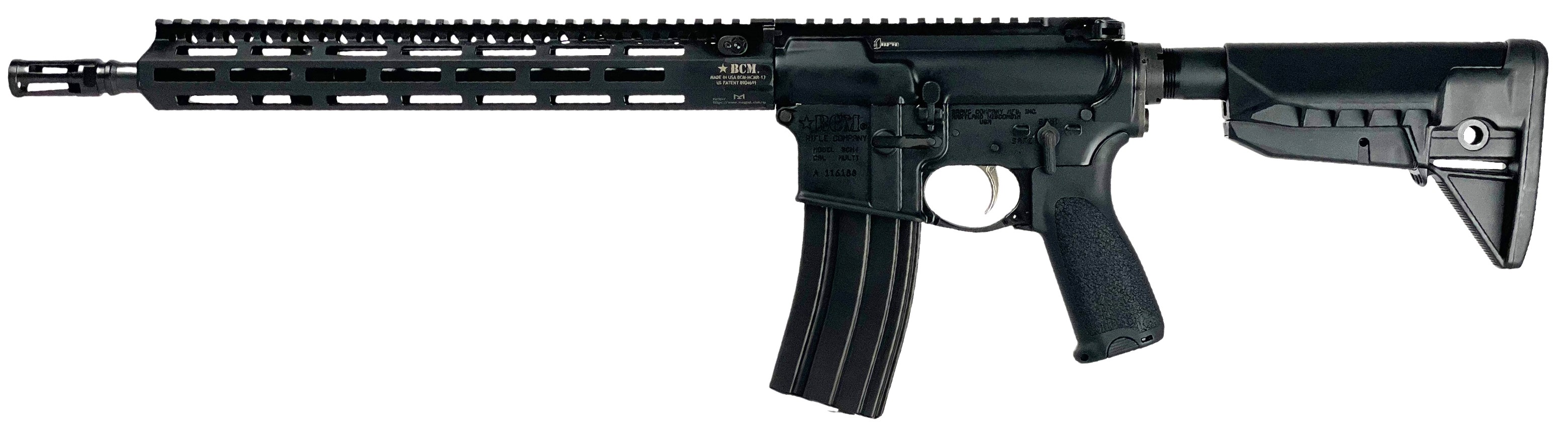 - Carabine semi-automatique de type AR-15 à emprunt des gaz direct. - Canon de 14,5". - Canon au pas de 1/7", chromé à l'intérieur et intégralement phosphaté à l'extérieur. - Canon contrôlé par magnétoscopie circulaire et longitudinale selon la norme Mil-Spec ASTME1444-01. - Le pas de rayure de 1 tour en 7" permet de stabiliser la MK262 ou tout autre cartouche équipée d'un projectile de 77 grains ainsi que toutes les autres cartouches conventionnelles à projectile plus léger. - Compensateur BCM MOD 3 soudé au canon - Carcasse et boîte de culasse en alliage aéronautique 7075T6 usiné à partir de pièces forgées. - Le "lower" (la carcasse) est compatible avec les conversions d'AR15 dont les dimensions sont MilSpec. Le "upper" BCM MK2 (l'action canonnée) est compatible avec toutes les carcasses d'AR15 dont les dimensions sont MilSpec. - L'extension de canon et la boîte de culasse comportent les rampes d'alimentation de type M4. - Culasse en acier Mil-Spec de type Carpenter 158. - Culasse éprouvée et contrôlée par magnétoscopie (HPT/MPI). - Culasse écrouie par grenaillage pour encore augmenter sa résistance. - Extracteur en acier d'outillage (acier à haute résistance). - Ressort d'extracteur amélioré BCM, entouré d'un "Crane O-ring" (joint torique spécial qui augmente la force de rétention de l'extracteur). - Clé de transporteur durcie selon les spécifications USGI. - Vis de clé de transporteur de grade 8, serties selon la norme Mil-Spec. - Anodisation MilSpec de type MIL-A-8625F, Type III, Class 2 sur la carcasse, la boîte de culasse, et le garde-main. - Plusieurs points de fixation d'attache de bretelle rapide à billes. - Crosse télescopique BCM "BCMGUNFIGHTER". - Buffer H (1 masselotte tungstène, et 2 en acier) - Détente BCM "PNT" (polie et revêtue nickel-teflon). - Levier d'armement élargi BCM MOD 3B - Poignée pistolet BCM MOD3. - Plaque de carcasse BCM avec point de fixation d'attache de bretelle rapide à billes - Pontet élargi BCM.