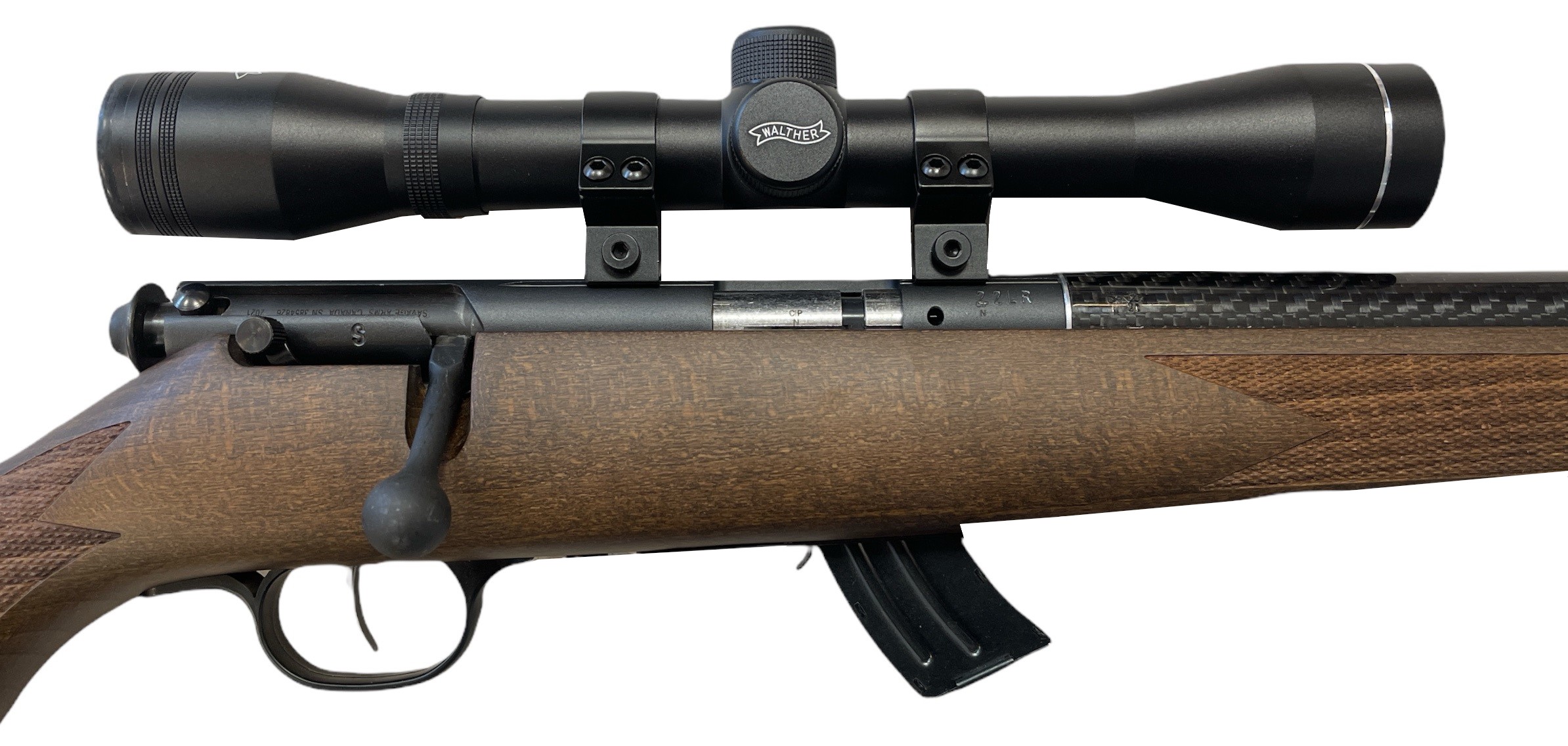 Livrée avec 1 chargeurs 9 coups et une lunette Walther 4x32 avec montage.