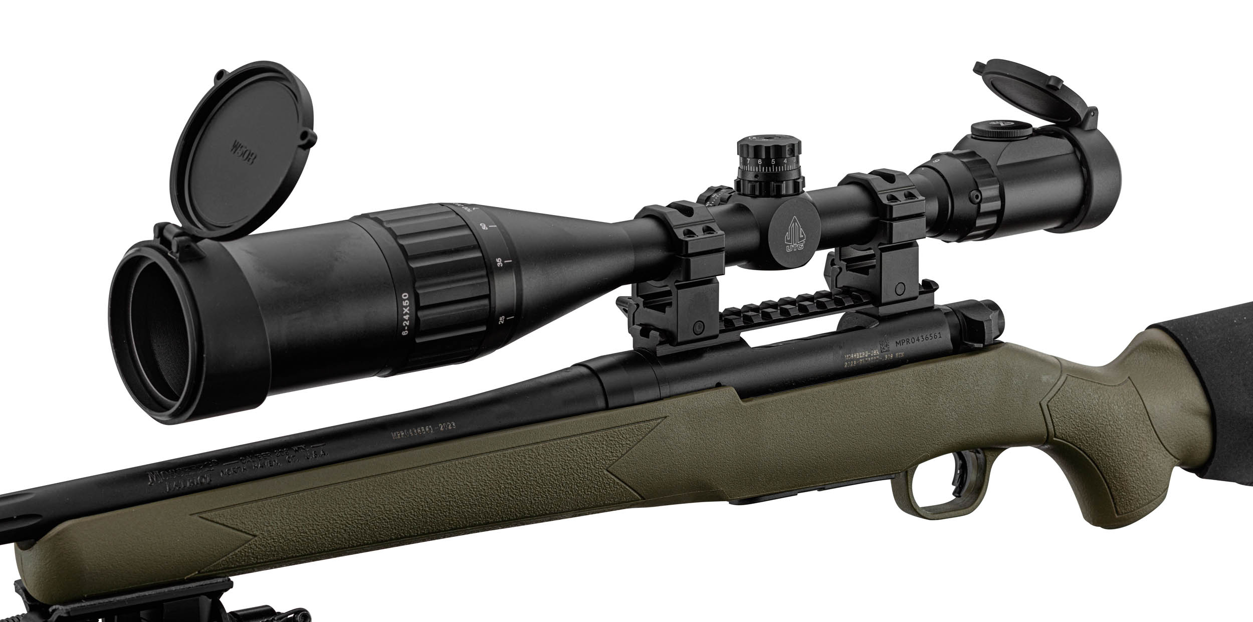 Equipée d'une lunette UTG 6-24x50 et d'un chargeur amovible 4 coups.