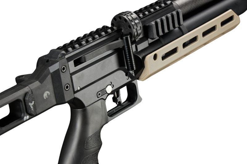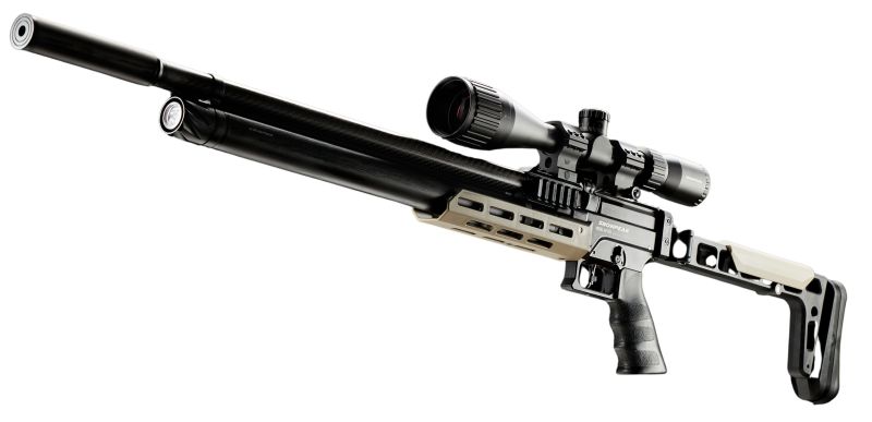 Carabine PCP a réaremement manuel (culasse linéaire) avec une crosse rabattable équipée d'une détente réglable, un chargeur rotatif, et un modérateur de son pour un confort maximal lors du tir.
