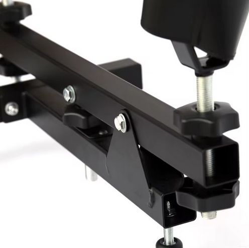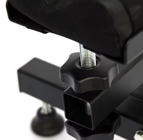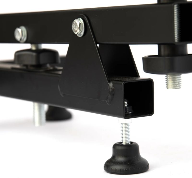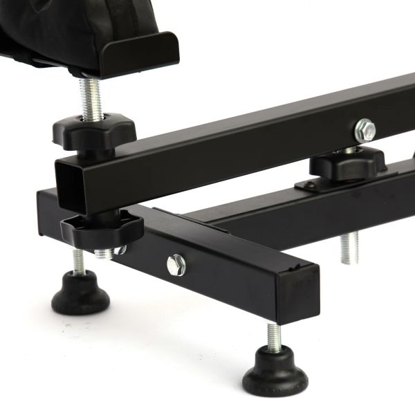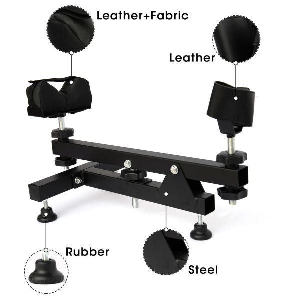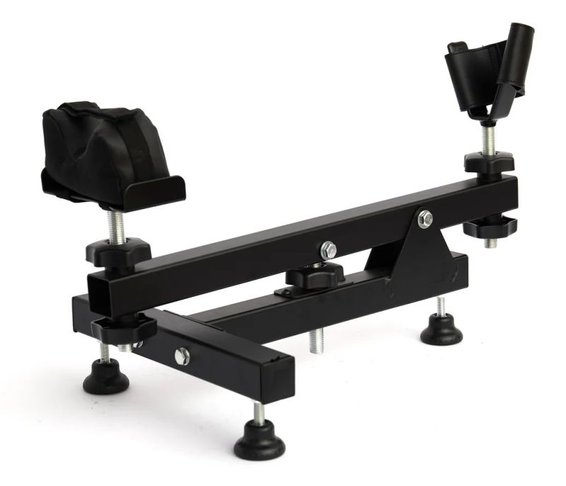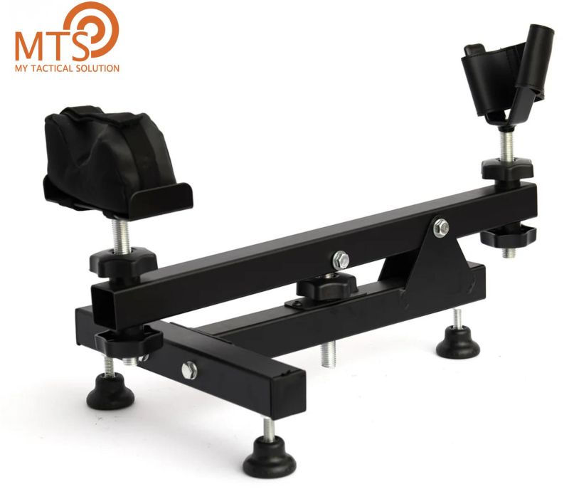 Support en acier entièrement réglable Permet de positionner une arme pour le tir, le réglage ou l'entretien Pieds et appuis réglables en hauteur Ajustement de la hauteur par molette centrale