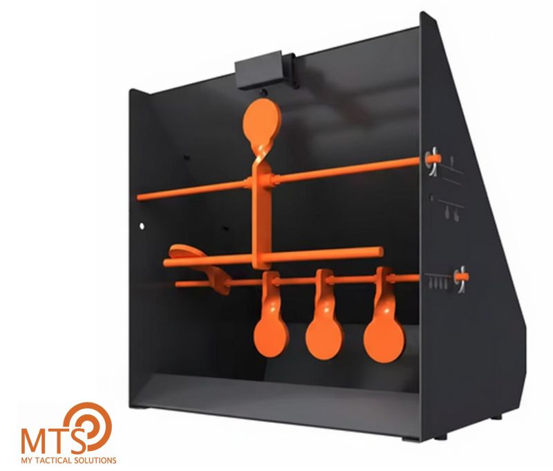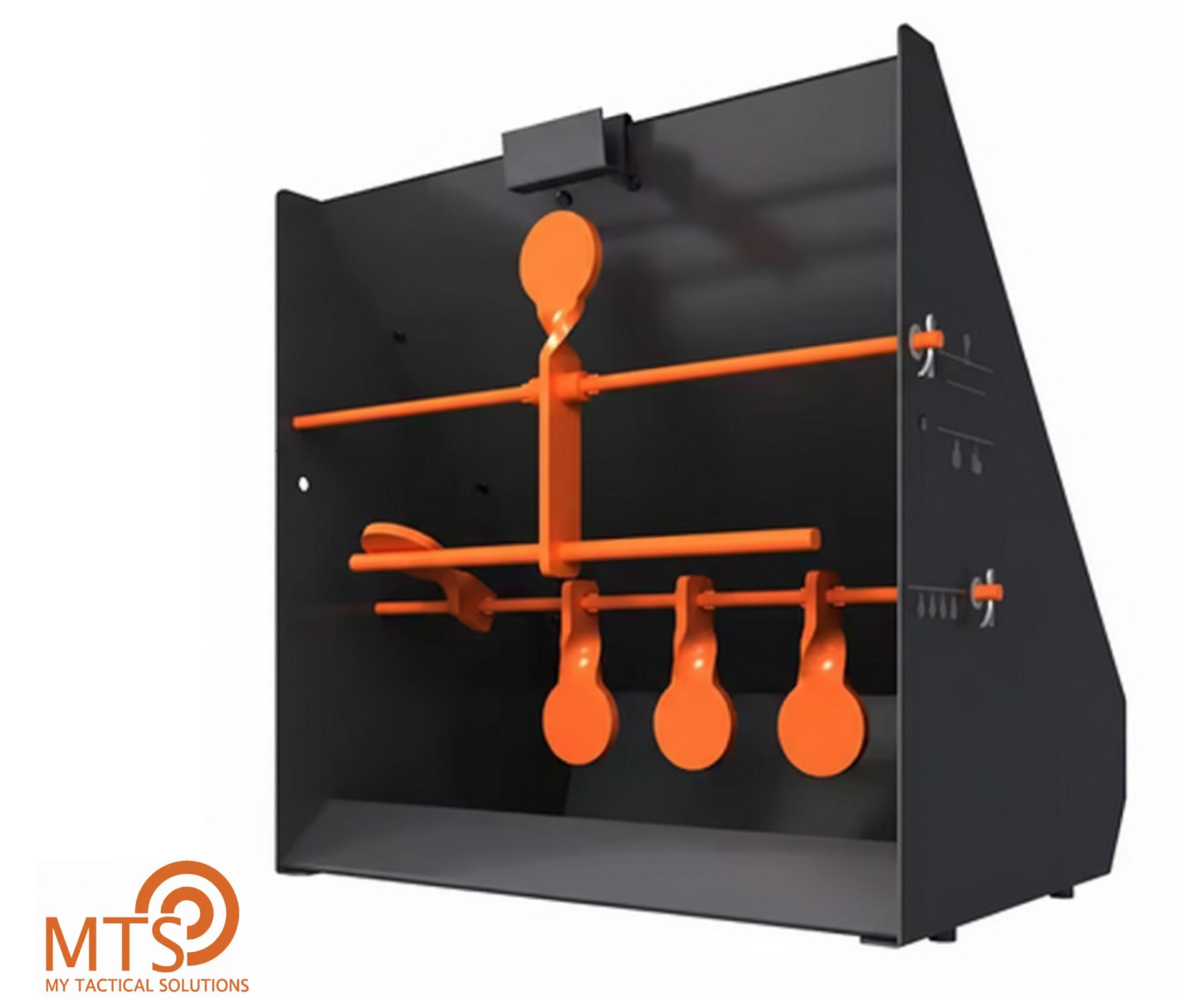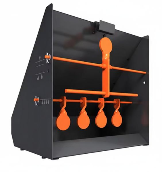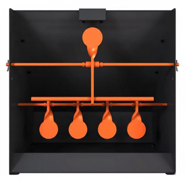 Nombre de gongs : 5 gongs ronds basculants Épaisseur des gongs : 5 mm chacun Matériau : Acier trempé AR500 (très haute résistance aux impacts) Finition : noir et peinture haute visibilité des gongs Fonctionnement : gongs basculants (celui de dessus permet de remettre les 4 autres dans leur position initiale de tir)