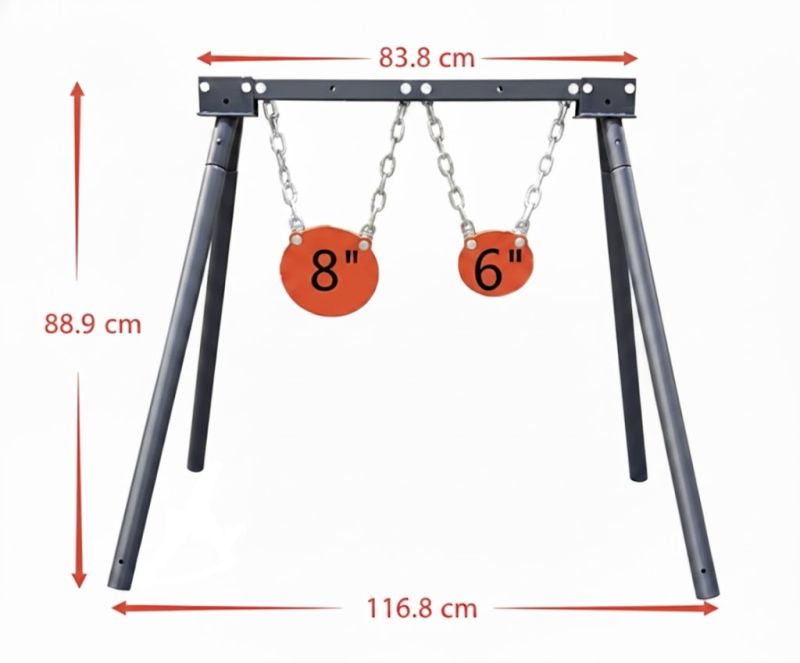 Cible composée de deux gongs circulaires en HARDOX 500 (AR500), épaisseur 10 mm, suspendus à un support métallique stable. Conçue pour fournir un feedback visuel et sonore immédiat à chaque impact. Matière HARDOX 500 (AR500)