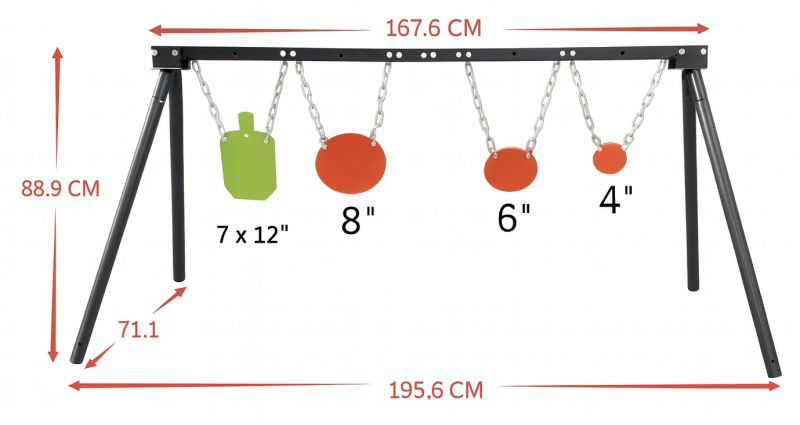 Nombre de gongs : 4 gongs ronds suspendus Épaisseur des gongs : 10 mm chacun Taille des gongs : 3 ronds (8", 6" et 4"), et un type silhouette (7x12") Matériau : Acier trempé AR500 (très haute résistance aux impacts) Montage : gongs suspendus par des chaines à un support métallique Finition : peinture haute visibilité argenté