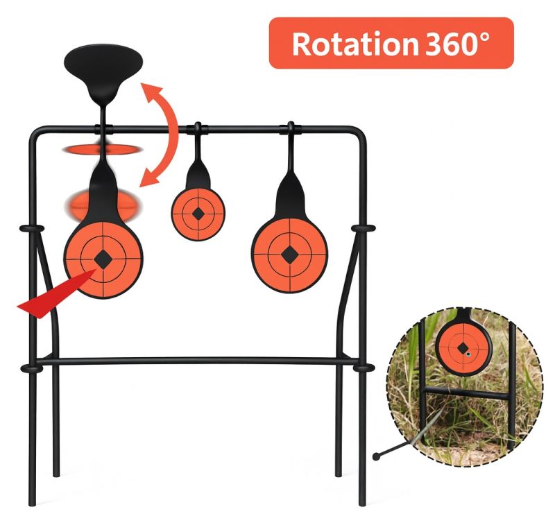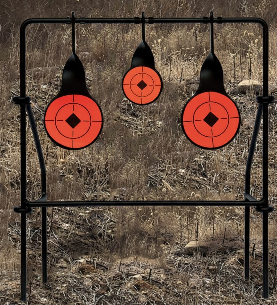 Cible rotative à 3 gongs dédiée au .22 LR : retour visuel immédiat, entraînements dynamiques et progression ludique.