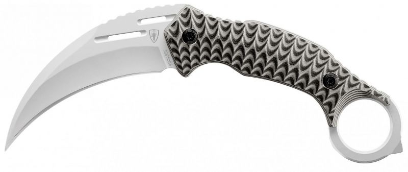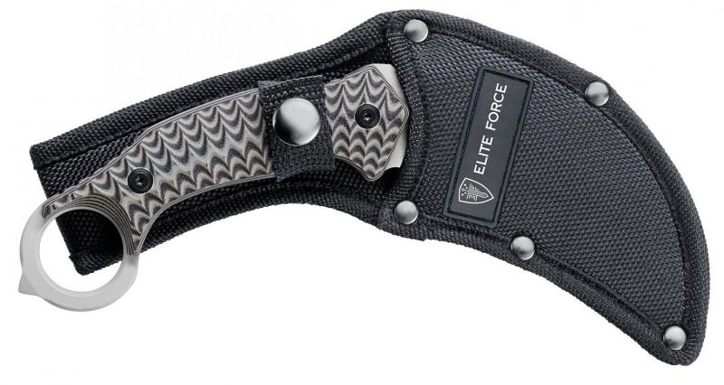 Ce couteau se distingue par sa forme de karambit en forme de griffe et son motif bicolore sur le manche. Comme la plupart des karambits, l'Elite Force EF715 peut être tenu de deux manières. La méthode conventionnelle consiste à passer votre petit doigt à travers l'anneau et à appuyer votre pouce contre la colonne vertébrale de la lame. Avec la poignée inversée, vous passez votre index dans l'anneau et enroulez vos autres doigts autour de la poignée. La finition satinée de la lame s'étend jusqu'à la pleine soie, qui contient les deux balances de poignée G10. Le couteau est livré avec une gaine en nylon pour un transport sûr.
