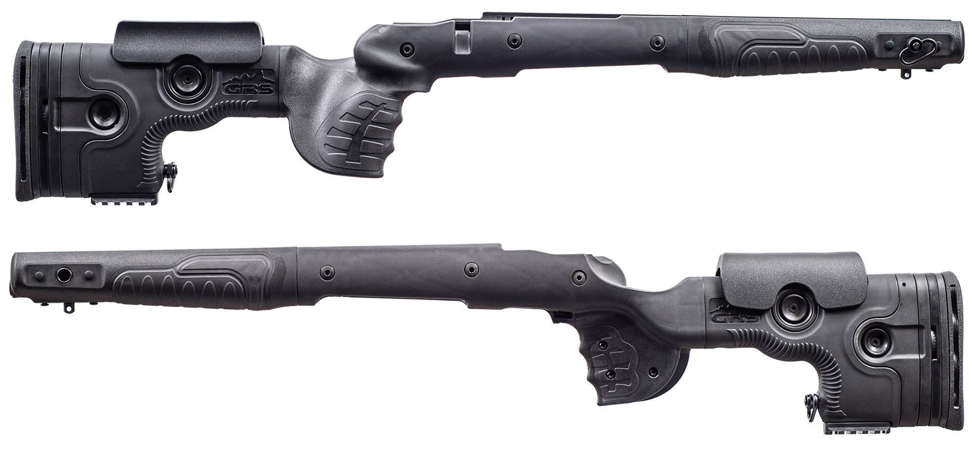 Cette crosse est équipée de série d'une plaque de couche réglable en hauteur et en inclinaison, et dispose d'un emplacement « spigot » pour monter le redoutable bipied GRS. Des rails Picatinny, des attaches rapides encastrées (Flush cups), des supports de bretelle QD et un pied de grenadière pour bipied sont déjà installés. C'est simple : tout y est.