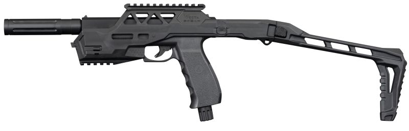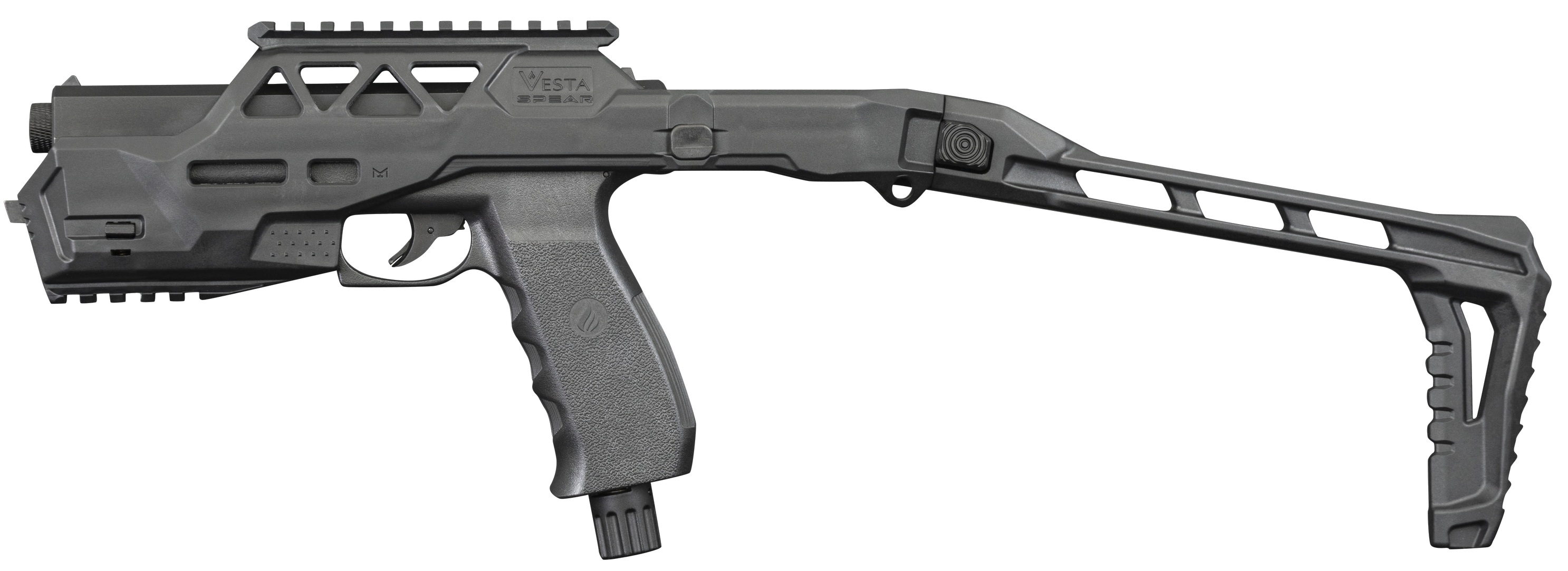 Transformez un pistolet Vesta en fusil tactique en quelques secondes grâce à cette innovation : le kit SPEAR. Il intègre un flashloader 6 coups qui permet le chargement de l'arme montée dans le kit, un brise-vitre, un double rail picatinny, un support de sangle ainsi qu'une crosse rabattable.