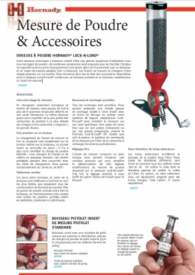 Cette doseuse volumique à boisseau rotatif offre une grande souplesse d'utilisation avec tous les types de poudre ; de nombreux accessoires sont proposés pour en faciliter l'emploi. Sa capacité va de 0,5 grain (0,03 gramme) à 265 grains (plus de 17 grammes) avec un boisseau et un insert de mesure adaptés (voir Boisseau avec insert pour doseuse HORNADY Lock-N-Load ). Les inserts de mesure se changent d'une simple pression sur un bouton. Vous trouverez plus bas la liste des accessoires disponibles pour la doseuse Lock-N-Load®. Livrée avec un boisseau carabine.
