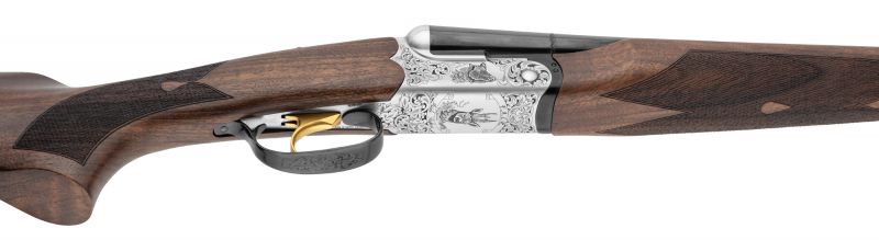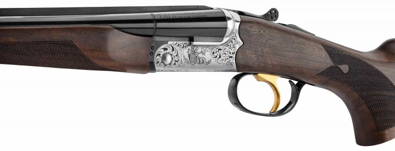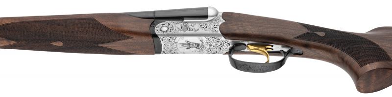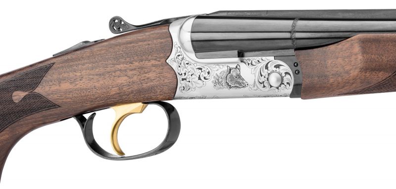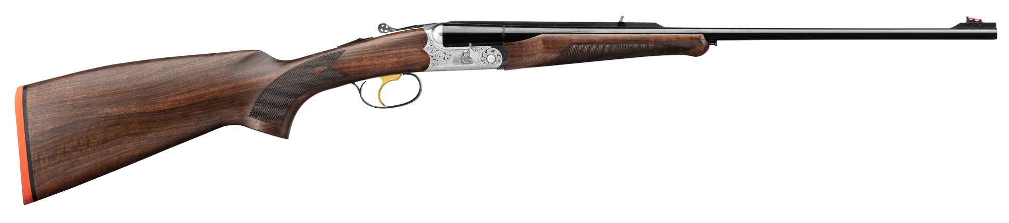 Express juxtaposé Ejecteurs Mono détente Bascule acier avec gravures fine Crosse en noyer sélectionné finition poncé huilé Canon de 55 cm avec visée fibre optique