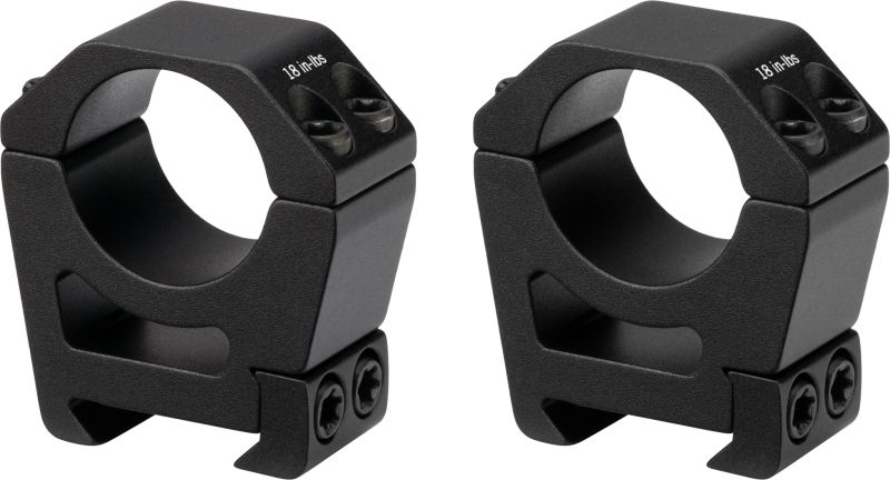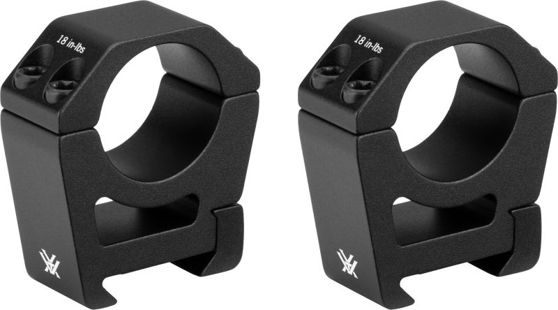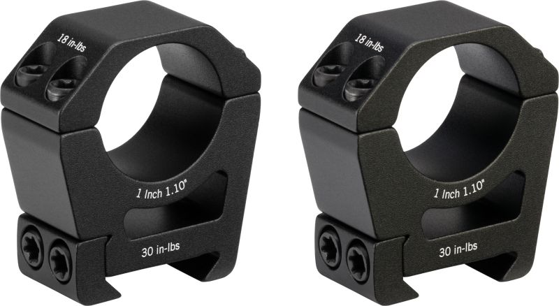 Colliers fabriqués en aluminium anodisé noir (Type II) avec tenon de recul intégré. Taille bas (H = 1,10 / 2,79mm). Type de montage : Weaver/Picatinny Diamètre : 25,4 mm Couple de serrage des vis gravé au laser sur les colliers. Vis de serrage coté rail : 30 in/lbs -> 3,38 Nm. Vis de serrage de la lunette : 15-18 in/lbs > 1,69 - 2,03 Nm.