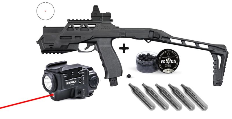 Transformez un pistolet Vesta en fusil tactique en quelques secondes grâce à cette innovation : le kit SPEAR. Il intègre un flashloader 6 coups qui permet le chargement de l'arme montée dans le kit, un brise-vitre, un double rail picatinny, un support de sangle ainsi qu'une crosse rabattable.