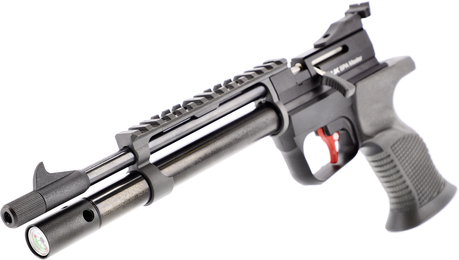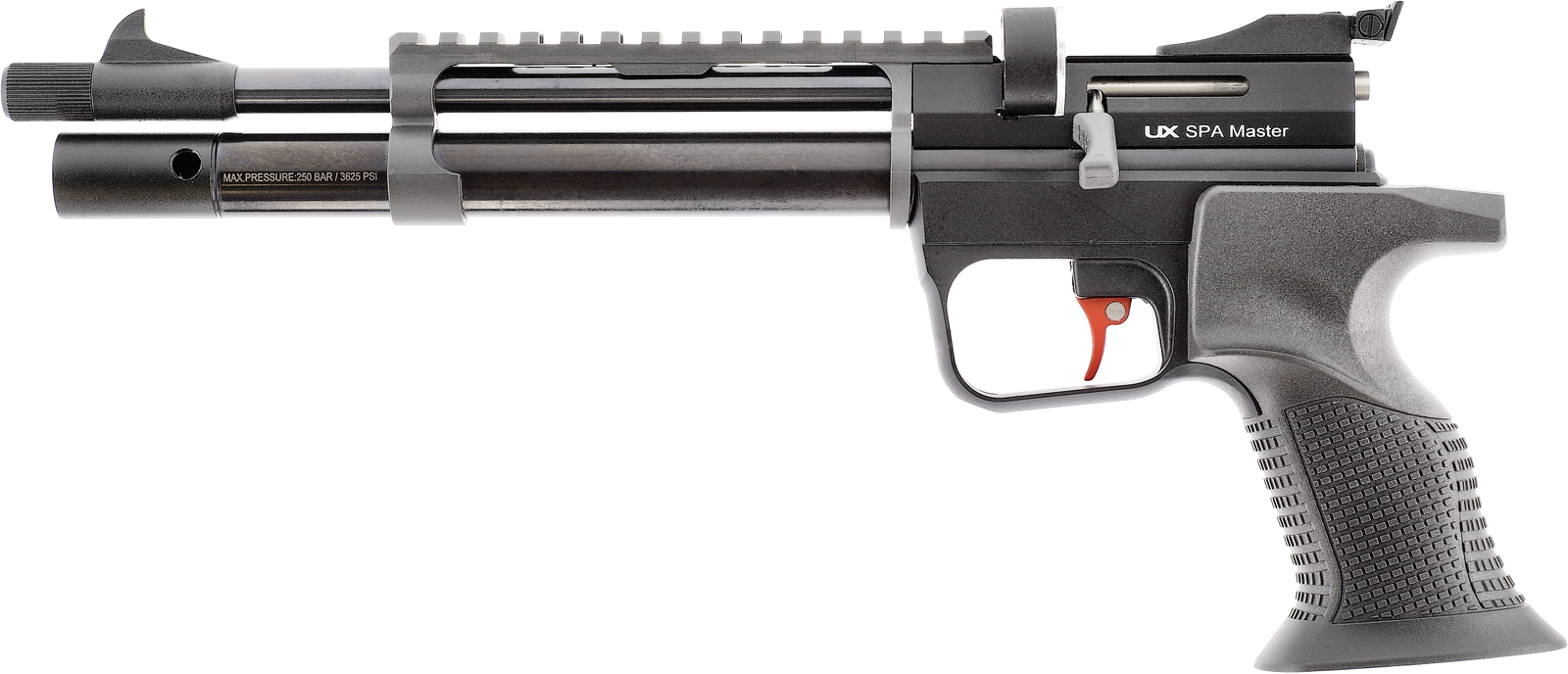 Le SPA Master est un pistolet à air précomprimé PCP destiné au tir sportif de loisir et à l'entraînement de précision. Alimenté jusqu'à 250 bar (3625 psi), il dispose d'un réservoir intégré de 60 cm3 avec manomètre permettant un contrôle direct de la pression. Son mécanisme à répétition en simple action assure un fonctionnement régulier. La détente sport, équipée d'une queue de détente métallique, garantit un départ net et précis. La visée ouverte comprend une hausse réglable et un guidon cible sous-coupé pour un alignement optimal. Il est doté d'un rail de 11 mm ainsi que d'un rail Picatinny pour le montage d'optiques. Sa poignée ergonomique convient aux tireurs droitiers et gauchers. Le canon est fileté en M10x1 et livré avec un adaptateur 1/2'-20 UNF. L'ensemble comprend un barillet rotatif et un plateau mono-coup.