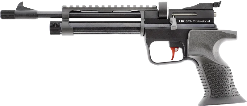 Le SPA Professional est un pistolet à air comprimé destiné au tir sportif de loisir. Alimenté par une cartouche CO2 de 12 g, il fonctionne en simple action avec un mécanisme à répétition fiable. Sa détente sport, dotée d'une queue de détente en métal, assure un départ net et régulier. Il dispose d'une hausse réglable et d'un guidon cible sous-coupé, permettant un ajustement précis pour le tir sur cible. Le rail de 11 mm ainsi que le rail Picatinny permettent le montage d'optiques adaptées. Sa poignée ergonomique convient aussi bien aux tireurs droitiers qu'aux gauchers. Le canon est fileté en M10x1 et livré avec un adaptateur 1/2'-20 UNF. L'ensemble comprend un barillet rotatif ainsi qu'un plateau mono-coup.