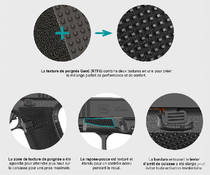 🔥 Une ergonomie revue en profondeur La nouvelle texture RTF6 assure un grip optimal, avec ou sans gants, que la main soit sèche ou humide. La carcasse plus bombée épouse naturellement toutes les formes de main, améliorant le confort et limitant la fatigue. L’undercut retravaillé sous le pontet permet désormais une prise plus haute, jusqu’à la queue de castor fixe, offrant un contrôle supérieur lors des tirs soutenus.