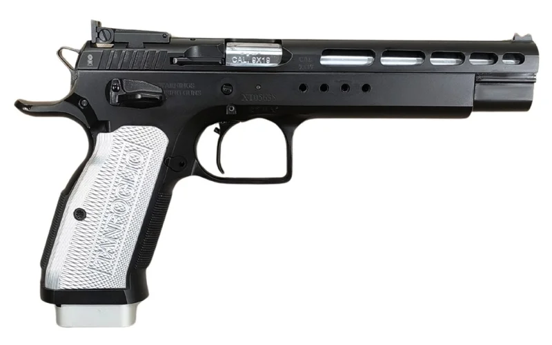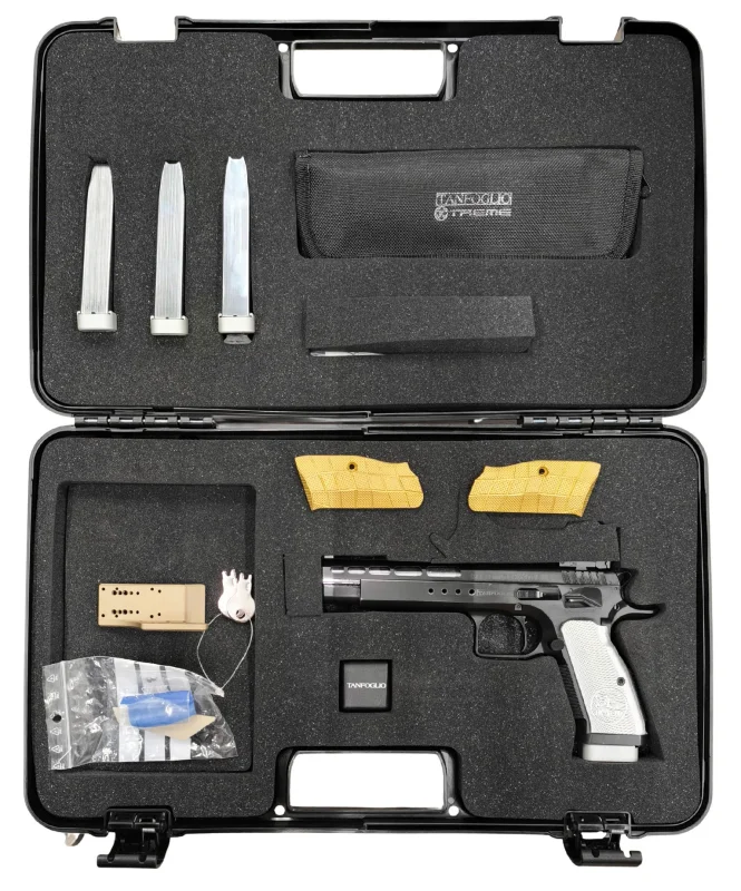 En stock, expédié sous 12/24h Livré dans une mallette à clé ABS TANFOGLIO avec 4 chargeurs 16 coups, une trousse de nettoyage, un guidon acier plein, un ressort de récupérateur , un montage TONI System pour point rouge et un jeu de plaquettes de poignée en laiton.