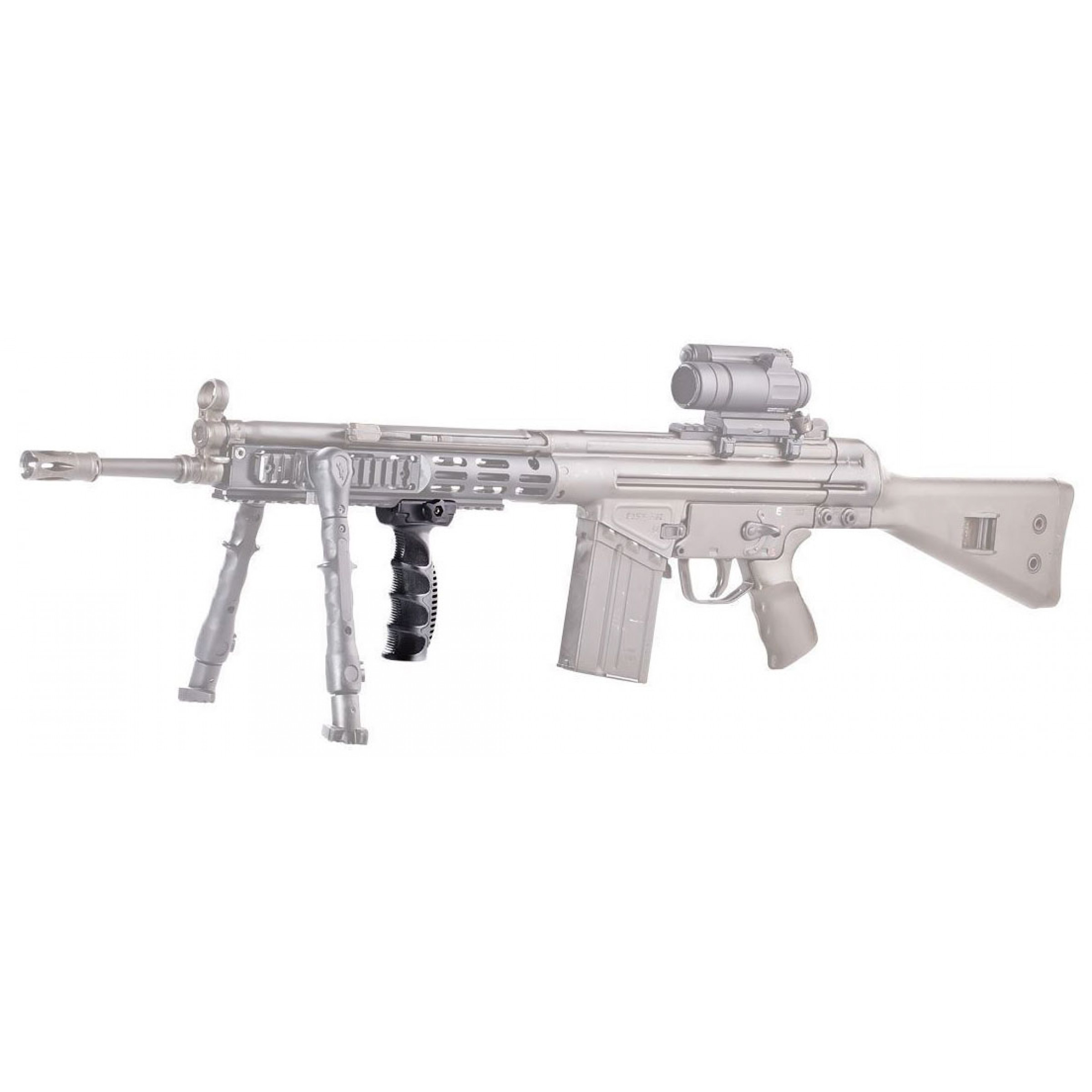 Pensée pour renforcer la précision et le confort de tir, cette poignée frontale se distingue par sa conception ergonomique et son revêtement en caoutchouc texturé. Sa structure moulée épouse la forme naturelle de la main, tandis que les surfaces antidérapantes assurent un maintien ferme, même en conditions humides ou avec des gants. Fabriquée en polymère robuste avec des inserts caoutchouc, elle combine légèreté et solidité. L'installation sur rail Picatinny se fait de manière rapide grâce à un système de fixation latéral sécurisé par une molette de serrage. Cette poignée améliore sensiblement le contrôle de l’arme, notamment lors des tirs dynamiques ou des déplacements prolongés. Elle s’adresse à tout utilisateur recherchant un appui avant fiable et confortable, sans compromettre la maniabilité ni alourdir son équipement.