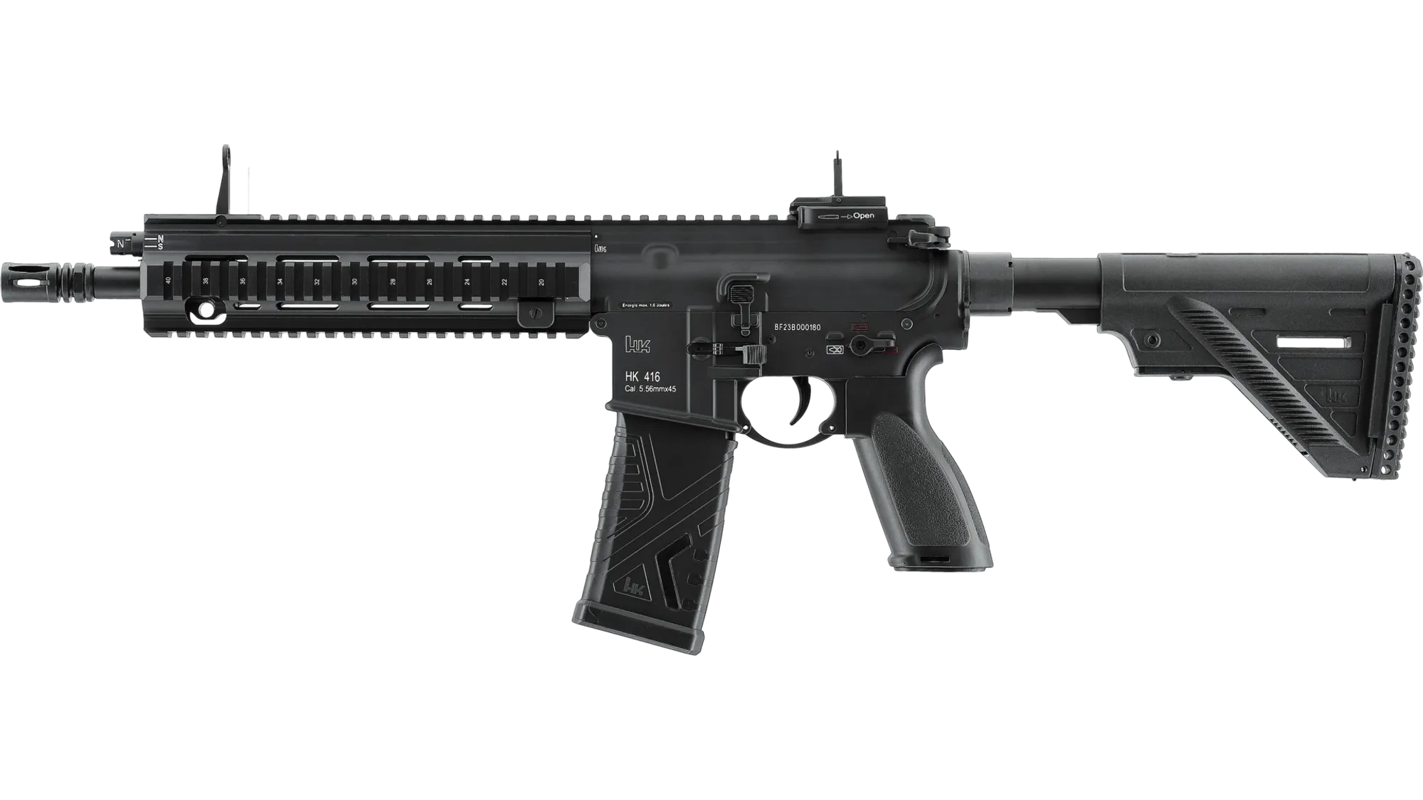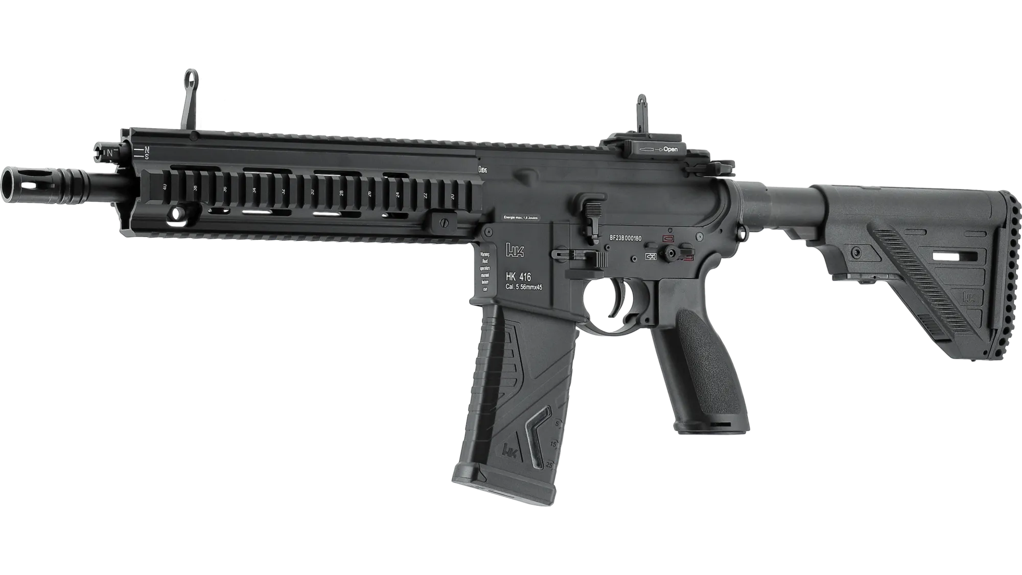 Réplique du fusil d’assaut HK416 Semi/full auto Full métal Batterie li-po 7.4 ou 11.1 v (non incluses) MOSFET Changement rapide de ressort Bloc hop-up réglable Quadrail picatinny Sélecteur de tir ambidextre Chargeur mid-cap de 120 coups