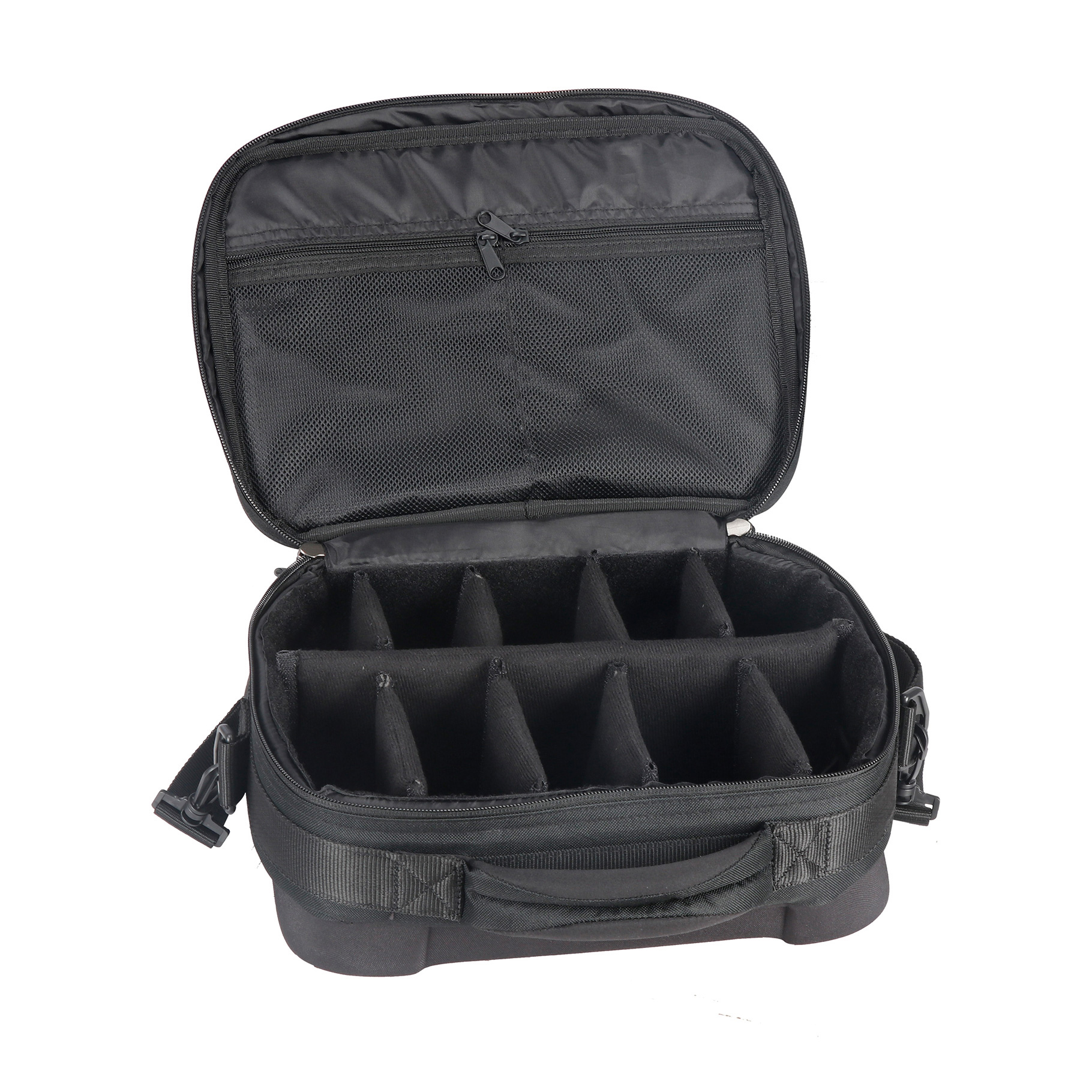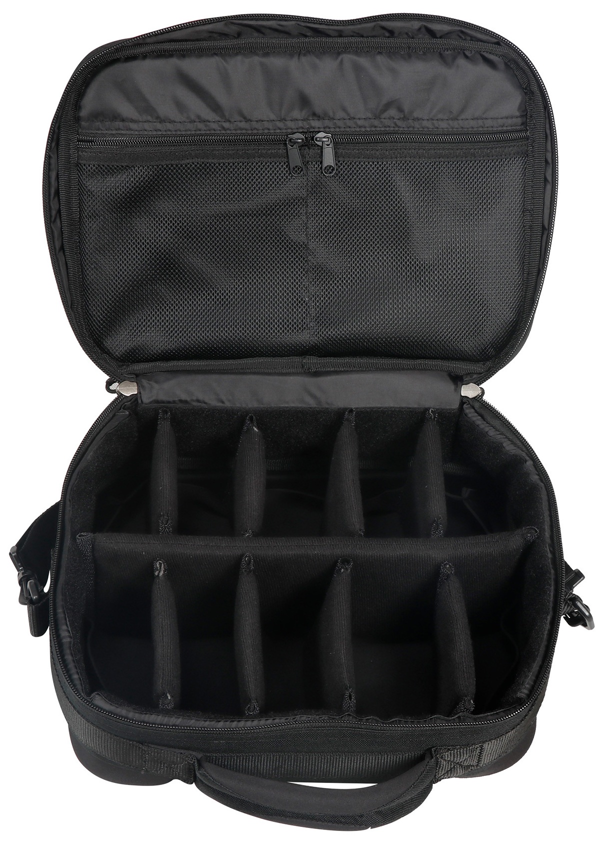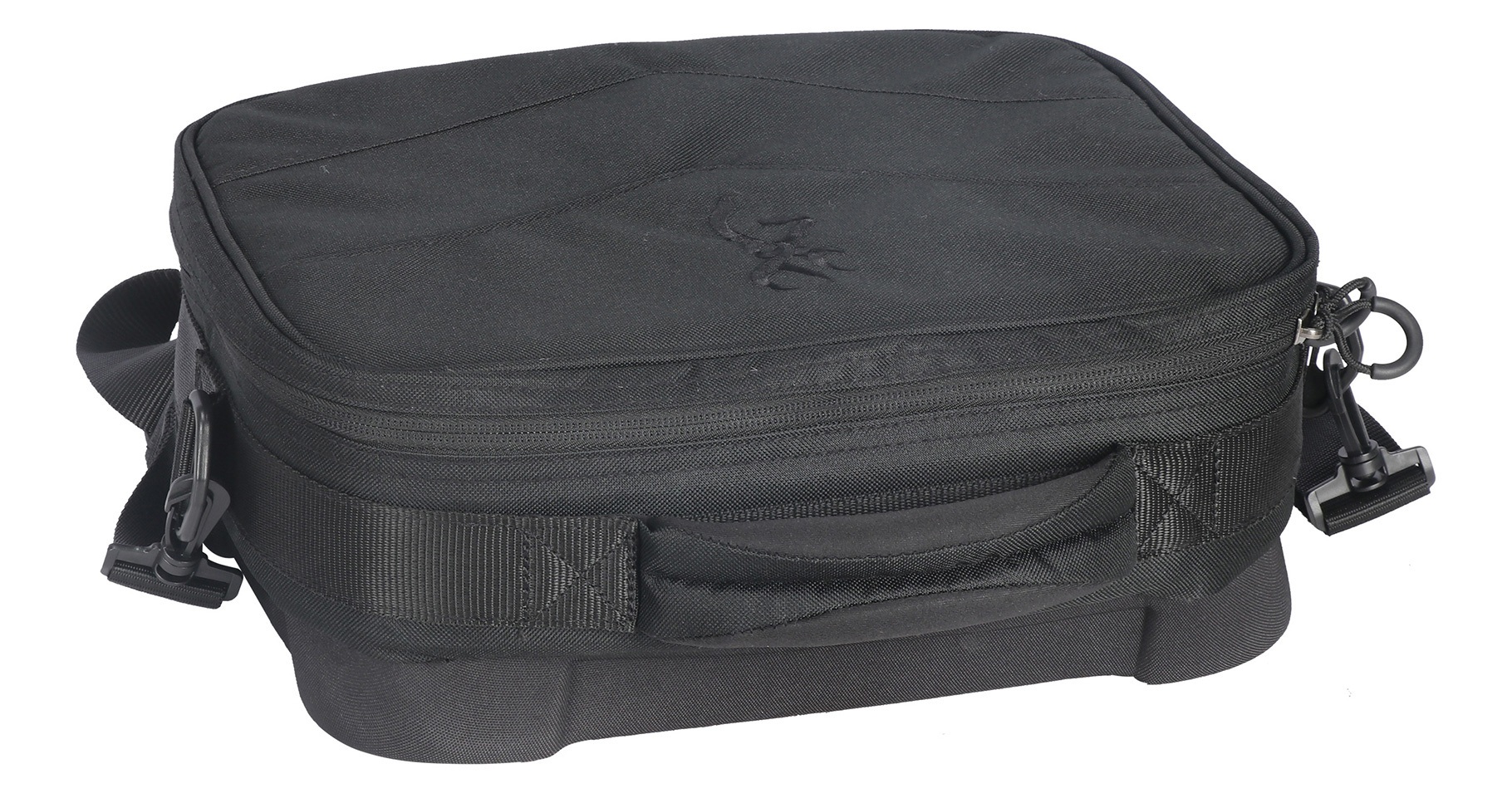 • Compartiment principal spacieux adapté au rangement d’une arme de poing et de chargeurs. • Séparateurs amovibles pour structurer l’intérieur selon vos besoins. • Poche filet zippée intérieure pour petits accessoires ou objets personnels. • Poignée de transport solide et bandoulière confortable pour un port facile. • Design discret et professionnel en noir.