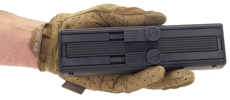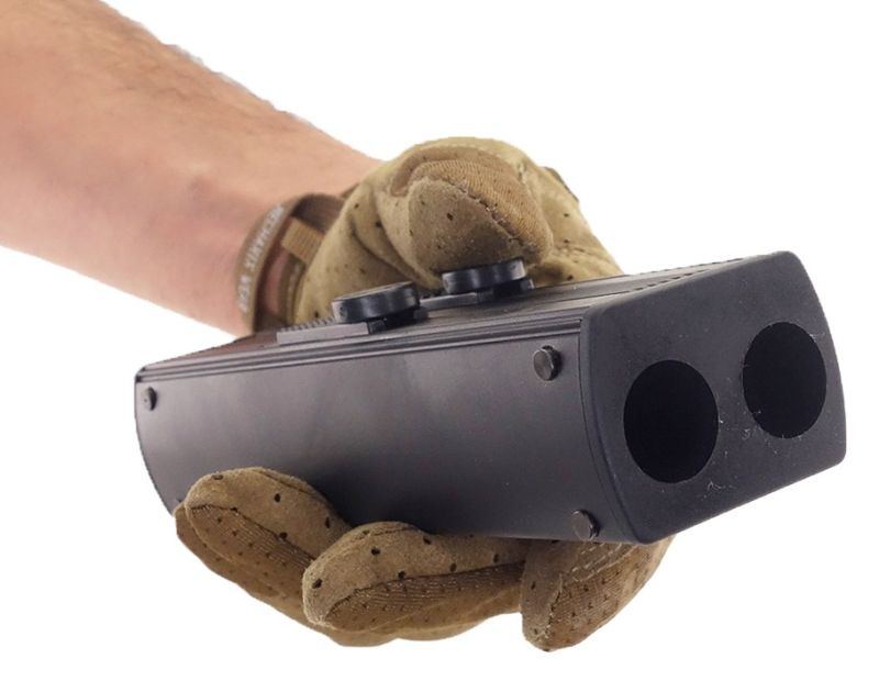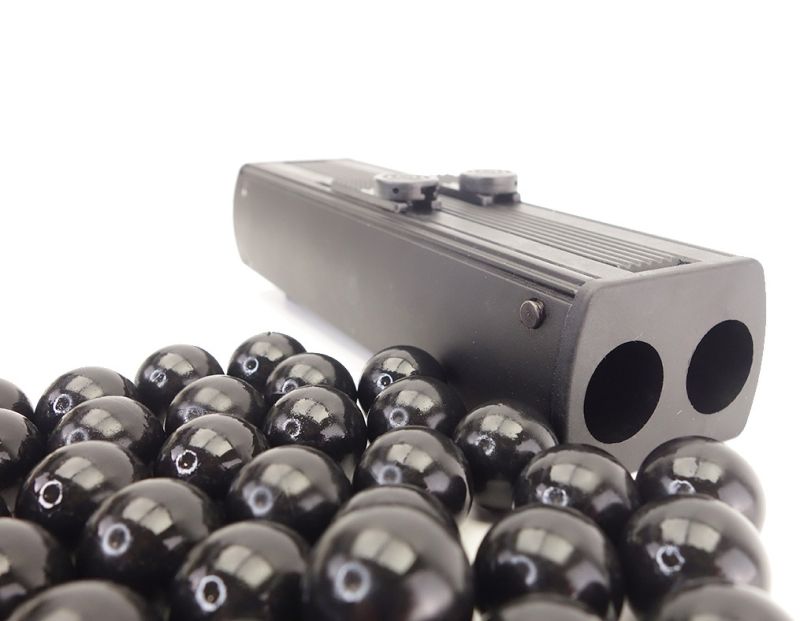 La conception "2 coups" permet de panacher les munitions : par exemple, un premier tir avec une bille caoutchouc pour l'impact, suivi d'un tir au poivre (OC) pour la neutralisation chimique.