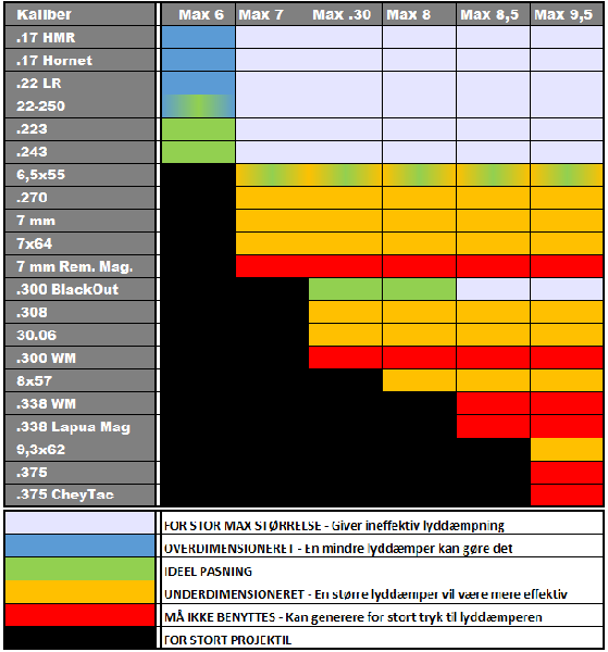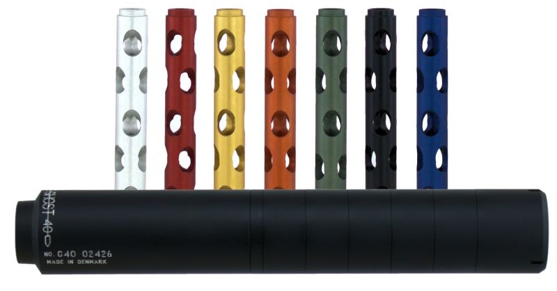 Diamètre du corps:40 mm Épaisseur max canon acceptée 23 mm (diamètre max à la bouche) Élongation (débord canon) 140 mm. Noyau interne en acier encapsulé dans corps en aluminium ; embouts avant/arrière soufflés et surface moletée Accessoires & modularité 4 inserts colorés fournis (Rouge, Jaune, Vert, Bleu) pour inner Ø ≈ 6 / 7 / 8 / 9,5 mm — inserts supplémentaires disponibles (.17, .30, 8.5 mm) Calibres recommandés Utilisable de .17 à .375 ; excellent à partir du 6.5×55 jusqu’au .375 (choisir modèle en fonction du plus gros calibre utilisé).