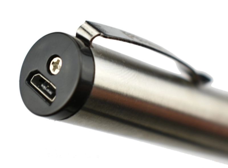 Stylo-taser rechargeable compact en acier inoxydable — puissant (2 400 000 V), discret et pratique grâce au port Micro-USB, indicateur de charge et clip de poche.