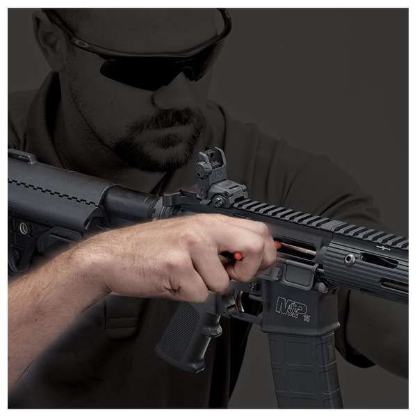 Indicateur de chambre vide Hornady® Rapid Rack qui sert également d’assistant rapide au chambrage et à l’armement de votre arme longue. Il suffit de l’insérer dans la chambre vide et le levier rouge d’armement dépasse de la portière d’éjection. Ensuite rabattre la culasse et insérer un chargeur plein. Le levier d’armement rouge indique clairement que la chambre est vide. Il faut ensuite épauler, attraper le levier, le tirer en arrière, le laisser tomber et votre arme se retrouve chambrée prête à tirer.