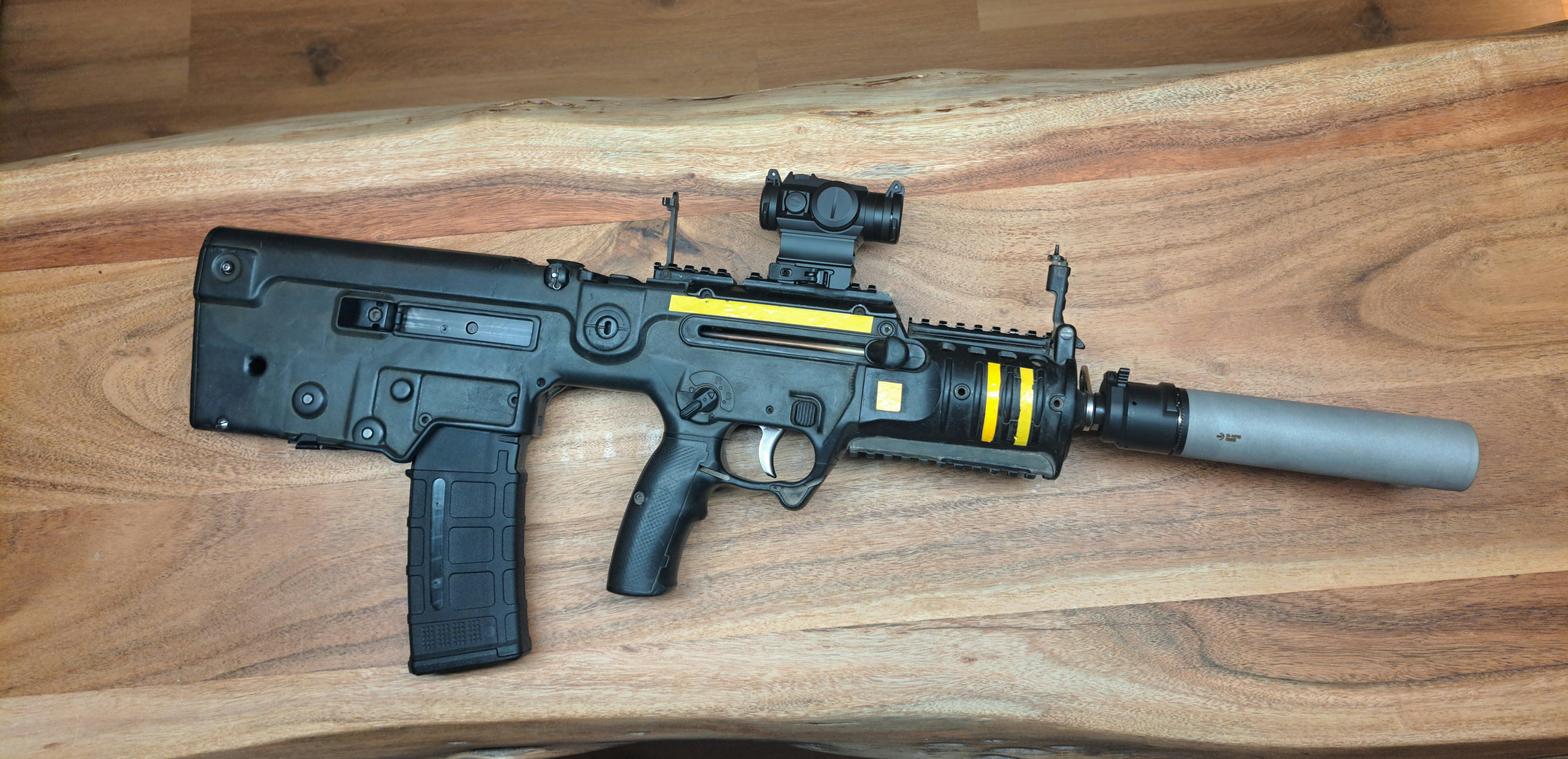 L’arme présentée sur les photos est un IWI Tavor X95, équipé d’un canon de 13 pouces, dans une configuration compacte et robuste typique de cette plateforme bullpup.